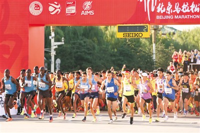 上周日7時30分,迎著金秋北京溫暖的陽光,3萬名跑步愛好者在北京馬拉松賽(下稱北馬)的起點線——天安門前高唱完國歌后出發(fā),跑向終點奧林匹克廣場。最終,來自摩洛哥的小伙博納思爾以2小時11分18秒的成績奪得男子組冠軍,埃塞俄比亞的貝耶內以2小時27分44秒的成績摘得女子組冠軍。