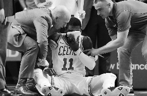 主場迎戰(zhàn)黃蜂,凱爾特人并不輕松,除去揭幕戰(zhàn)中重傷恐賽季報(bào)銷的海沃德,霍福德也因傷休戰(zhàn),波士頓三巨頭僅剩歐文一人,而他也在開場不久被隊(duì)友貝恩斯誤傷,面部遭肘擊后血灑賽場,無奈提前退賽。凱爾特人受此打擊后連丟5分,黃蜂打出9比0開局,并以26比11領(lǐng)先結(jié)束首節(jié)。上半場,兩隊(duì)分差被拉大到16分。