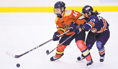| 12月10日,深圳昆侖鴻星隊(duì)球員(左)和深圳萬科陽光隊(duì)球員在CWHL(加拿大女子冰球聯(lián)賽)常規(guī)賽比賽中拼搶。 |