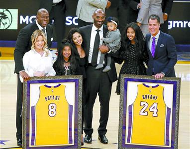 在珍妮發(fā)言結(jié)束后,在球館上空退役球衣墻上,8號(hào)與24號(hào)球衣緩緩展開(kāi),與另外9件退役戰(zhàn)袍高懸于斯臺(tái)普斯中心的上空。兩個(gè)號(hào)碼與20年的職業(yè)生涯,就此在“紫金軍”歷史中封存,成為閃耀著光輝的豐碑。雙球衣號(hào)碼退役,是湖人給予科比的終極榮譽(yù)。在NBA歷史中,科比是第一位獲得兩個(gè)球衣號(hào)碼同時(shí)退役殊榮的球員。