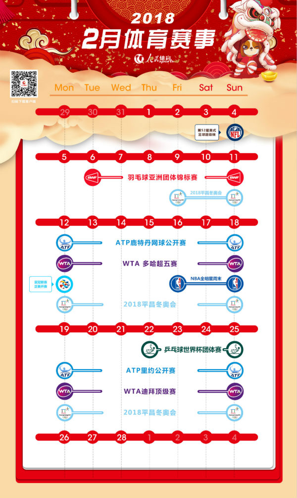 2月恰逢中國新春佳節(jié),在這辭舊迎新的月份中,體壇也大賽不斷。四年一屆的冬奧會,中國冰雪健兒是否會有新的突破,人民體育記者將親赴現(xiàn)場,為您報道;乒乓球世界杯團體賽是乒壇開年的首個大賽。2017下半年經(jīng)歷小低谷的中國男乒急需為自己正名,面對擁有波爾、奧恰洛夫的德國隊,以及進步明顯的日本隊,他們能否一一擊敗收獲8連冠,我們拭目以待。除此之外,NBA全明星周末對每個籃球迷都是大節(jié)日,看籃球巨星如何玩轉(zhuǎn)比賽;亞冠聯(lián)賽也將在本月開賽,中國球隊的表現(xiàn)令人期待。春節(jié)長假,闔家歡聚,邊看比賽邊過大年,這體驗一定不錯,收藏我們的賽歷,精彩賽事,一覽無遺。