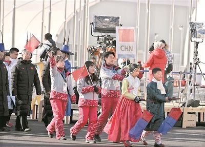參與今天升旗儀式的中國體育代表團約有80人,在升旗后的表演中可謂是盡顯韓國特色,從冬奧村村長到表演人員都是身著韓國民族傳統(tǒng)服裝,而且很好地將現(xiàn)代與傳統(tǒng)結(jié)合起來,尤其特別的是在結(jié)束時表演人員盡邀參與升旗儀式的中國體育代表團集體互動,從而使得現(xiàn)場變成一場載歌載舞的歡樂“趴”。