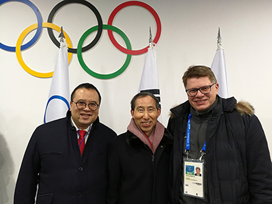中國國際文化傳播中心執(zhí)行主席龍宇翔(中)在平昌冬奧會開幕式上