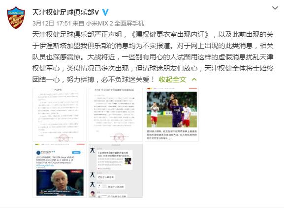 天津權(quán)權(quán)健官微寫道:“天津權(quán)健足球俱樂部嚴(yán)正聲明,《曝權(quán)健更衣室出現(xiàn)內(nèi)訌》,以及此前出現(xiàn)的關(guān)于伊涅斯塔加盟我俱樂部的消息均為不實報道。對于網(wǎng)上出現(xiàn)的此類消息,相關(guān)隊員也深感震驚。大戰(zhàn)將近,一些別有用心的人試圖用這樣的虛假消息擾亂天津權(quán)健軍心,類似情況已多次出現(xiàn),但請球迷朋友們放心,天津權(quán)健全體將士始終團結(jié)一心,努力拼搏,必不負球迷關(guān)愛!”