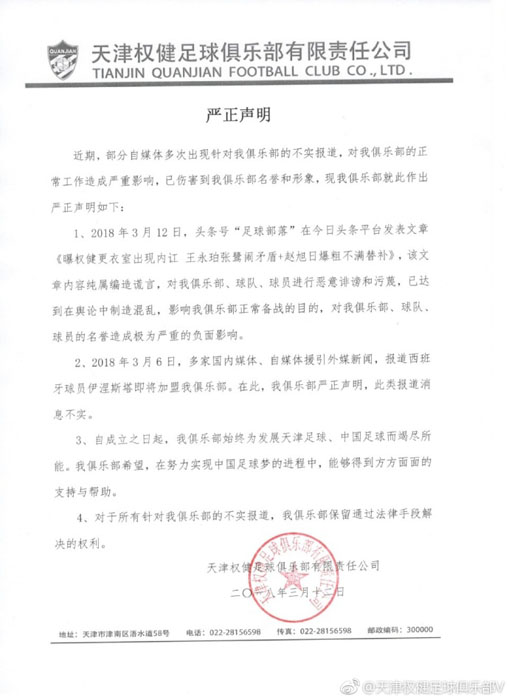 人民網(wǎng)北京3月13日電(胡雪蓉) 3月12日,天津權(quán)健足球俱樂部官方微博發(fā)表聲明,稱近期出現(xiàn)的有關(guān)權(quán)健更衣室不和及引進球星伊涅斯塔的消息均為不實報道,“天津權(quán)健全體將士始終團結(jié)一心,努力拼搏,不負球迷關(guān)愛!蓖瑫r,俱樂部表示對于所有的不實報道保留通過法律手段解決的權(quán)利。