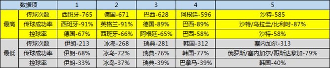 而在控球方面,崇尚傳控打法的球隊(duì)顯然會(huì)占據(jù)控球率的前列,但控球不等于贏球,將“Tika-Taka”玩的最熟練的顯然是西班牙,他們不僅有著場均765次的驚人傳球次數(shù)以及場均91%的傳球成功率,并依靠著前鋒迭戈-科斯塔的優(yōu)秀發(fā)揮,以小組第一順利出線;而與此形成鮮明對比的是一向以簡單、高效打法著稱的德國隊(duì),居然也開始走上了“Tika-Taka”的路線,3場小組賽,德國擁有32支球隊(duì)最高的控球率67%(比西班牙的66%還高),同時(shí)居然也擁有場均671次的傳球次數(shù)和89%的傳球成功率,但遺憾的是勒夫的“無鋒”戰(zhàn)術(shù),讓進(jìn)攻的最后關(guān)頭啞了火。