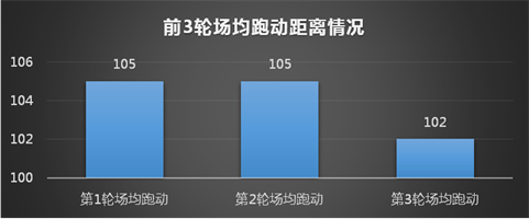 本屆世界杯小組賽,場均跑動(dòng)距離為104km,三輪的場均跑動(dòng)距離分別為:105km、105km和102km。