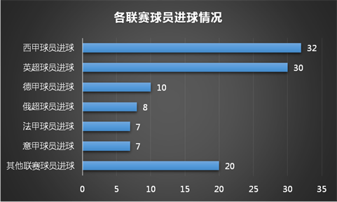 從小組賽進(jìn)球的球員所屬聯(lián)賽分布來看,來自14個(gè)國家的21名西甲球員包辦了最多的32粒入球,英超球員打入了30粒進(jìn)球排名第二,來自五大聯(lián)賽的德甲、法甲、意甲球員分別打入了10粒、7粒和7粒,值得一提的是,來自3個(gè)國家的5名俄超聯(lián)賽球員共打入了8粒進(jìn)球,排名第4,而來自廣州恒大淘寶的韓國球員金英權(quán)是中超球員打入世界杯入球的唯一球員。