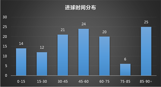 本屆世界杯讓大家印象深刻的是出現(xiàn)了多場比賽的絕殺與絕平的比賽,而從進(jìn)球時(shí)間分布來看,也印證了這一點(diǎn),據(jù)統(tǒng)計(jì),在比賽的85+分鐘進(jìn)球的數(shù)量達(dá)到了25粒,占總進(jìn)球的20.5%,其次是下半場開場后的15分鐘,進(jìn)球數(shù)達(dá)到了24粒。