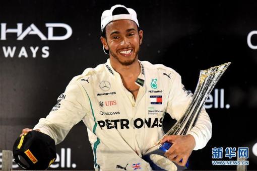 11月25日,漢密爾頓在領(lǐng)獎(jiǎng)臺(tái)上慶祝奪冠。 當(dāng)日,2018賽季世界一級(jí)方程式賽車錦標(biāo)賽(F1)最后一站比賽在阿聯(lián)酋阿布扎比結(jié)束爭奪,梅賽德斯車隊(duì)英國車手漢密爾頓……