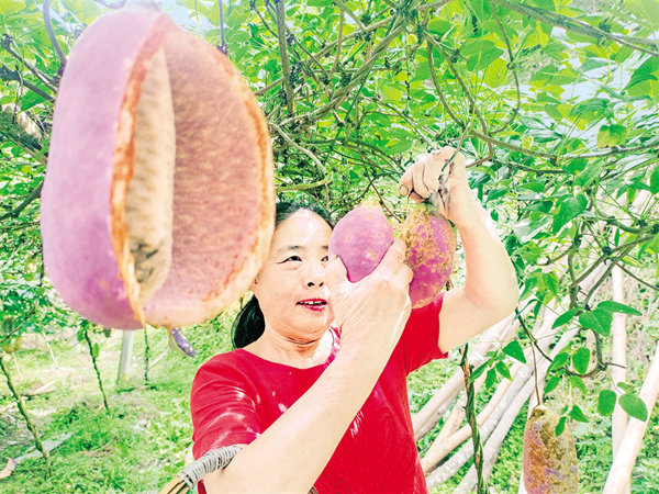 遠(yuǎn)嫁安徽的漢濱區(qū)雙龍鎮(zhèn)謝坪村魏澤會(huì),在外打拼一生,年逾花甲思鄉(xiāng)心切,于2018年回到家鄉(xiāng),在老家附近的一條山溝里,栽種了30畝八月炸。今年,八月炸喜獲豐收。走進(jìn)園區(qū),一行行、一架架八月炸藤蔓,掛滿(mǎn)了粉紅的果實(shí),有的裂開(kāi)果肉,像極了開(kāi)懷大笑的娃娃。魏澤會(huì)說(shuō):“今年產(chǎn)量達(dá)到3萬(wàn)公斤左右,因八月炸不易保存,謝坪村第一書(shū)記汪道軒和陜西省生態(tài)廳環(huán)境信息中心駐村干部馬祥一起,先后通過(guò)網(wǎng)絡(luò)推介、電商促銷(xiāo)和臨時(shí)售賣(mài)點(diǎn)等幫我們銷(xiāo)售。”為了最大限度增收,魏澤會(huì)已嘗試?yán)冒嗽抡ㄡ劸、榨油等,均已成功,因產(chǎn)量很小,暫未對(duì)外銷(xiāo)售。