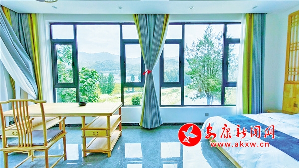 半山腰的獨(dú)棟別墅白墻黑瓦,飛檐峭壁,處處滲透著平淡質(zhì)樸的古典韻味;张山ㄖ骋星嗌剑娉瘝{谷,壩河水在谷間緩緩流淌。別墅里每一間都布置得精致高端,站在二樓落地窗前,觀連綿青山,賞花鳥(niǎo)飛禽,讓人陡然間心靜如水。