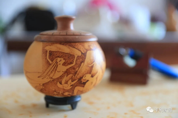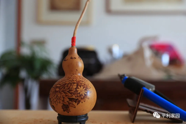 一組葫蘆,一組小物件。上面的畫,全是腦海中的圖案,烙筆一拿,眼睛一閉,線條在流淌,輕勾細(xì)挑,提捺頓按,全是走的心靈深處的路徑。