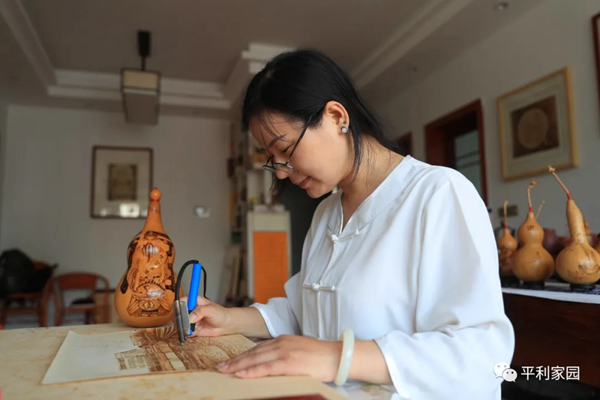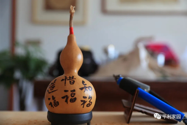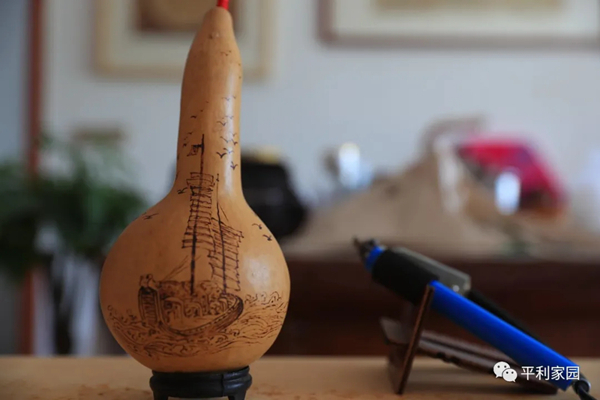 一組葫蘆,明黃里透出古色,熠熠生輝的畫幅里,平利雄山秀水滴滴溢出,一時(shí)間,香氣四溢,鄉(xiāng)風(fēng)彌漫,整個(gè)房間便裝滿女媧故里平利的山山壑壑。