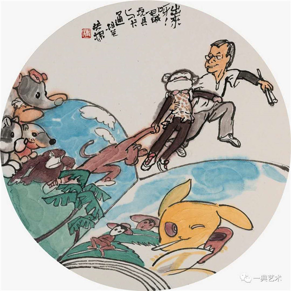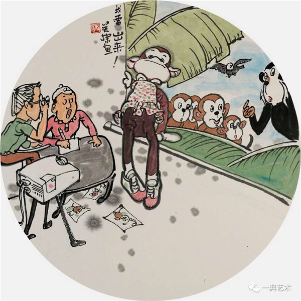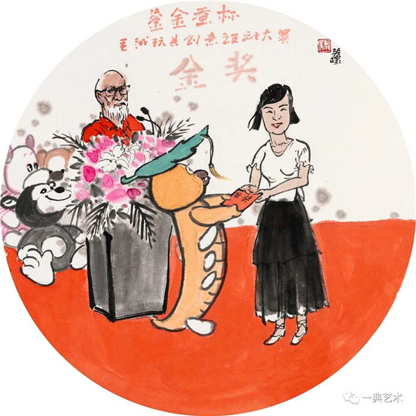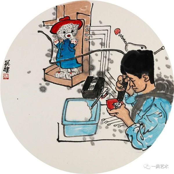 創(chuàng)作這個(gè)題材,我思考的內(nèi)容是豐富的,表達(dá)方式是明晰的,創(chuàng)作沖動是豐沛的。在初期,當(dāng)沒有門徑的時(shí)候,曾經(jīng)請人社局根據(jù)文字資料“劃重點(diǎn)”,而人社局領(lǐng)導(dǎo)給了很寬泛的態(tài)度:沒有重點(diǎn),只要和毛絨玩具相關(guān)。這一態(tài)度實(shí)際上解放了我的思想,放開了我的手腳:尋求有約束的自由——給以充分自由——自我追尋“有約束”的自由。好吧,自己給自己尋找方向!考察結(jié)束,創(chuàng)作方向已經(jīng)確定:以人和毛絨玩具作為主要表現(xiàn)內(nèi)容,以中國水(彩)墨畫為形式。在那幾天(直至今日)我頭腦里充斥著毛絨玩具和女工的形象,兩者形異神同,就像《西游記》中人神共處。因此,創(chuàng)作中我將人和物都以“人”的精神面貌進(jìn)行刻畫,為了藝術(shù)語言的統(tǒng)一,將人略作夸張,并力求“以形寫神”“形神兼?zhèn)?rdquo;,并設(shè)定一定情節(jié)性、趣味性。實(shí)際上毛絨玩具在設(shè)計(jì)過程中,應(yīng)該是運(yùn)用了文學(xué)領(lǐng)域的比喻、比擬、夸張、類比、通感等修辭手法,這也是我在創(chuàng)作中經(jīng)常用到的手法。我是一個(gè)中國畫家,因此作品強(qiáng)調(diào)中國畫的意蘊(yùn),任何時(shí)候,不忽略筆墨的表現(xiàn)。為了符合這個(gè)產(chǎn)品的特性(裝飾性、時(shí)尚性),我有意識吸取了一些水彩畫的表現(xiàn)語言。無論從思想上、技法上,不脫節(jié)傳統(tǒng)、不疏離當(dāng)代。這種表現(xiàn),(也許)增加了作品的藝術(shù)性。