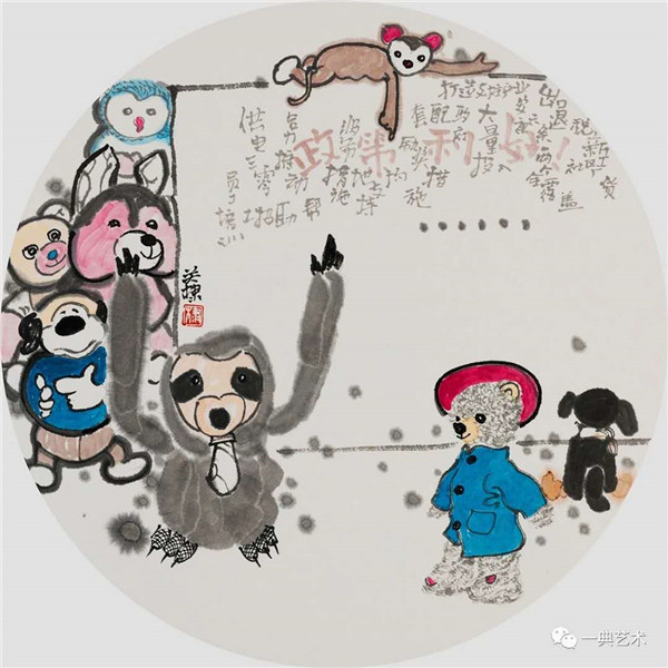 對于政策性的以及企業(yè)生產(chǎn)經(jīng)營活動,在這批作品中也有一定的表現(xiàn)。表現(xiàn)這種內(nèi)容是有難度的。創(chuàng)作中,我設(shè)定了毛絨玩具與政策的“互動”:譬如,我在一幅畫中,一群玩具的背影在觀看“安康六條”,而“安康六條”的縫隙,畫了許多活潑淘氣的玩具,透露出毛絨玩具產(chǎn)業(yè)的興旺發(fā)達(dá)。另一幅是一些毛絨玩具在好奇地觀看“看板”上的各種支持政策,一個(gè)調(diào)皮的猴子趴在看板頂頭給大家講解政策,擬人化、趣味性、含蓄、有情境,應(yīng)該解決了這類“難題”。